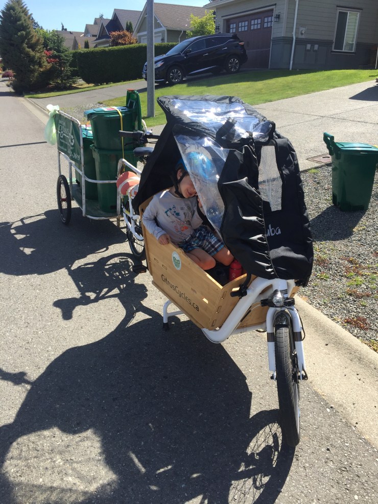 We are comforted and inspired to have been voted Best Green Business in the Cowichan Valley Citizen’s ‘Best of Cowichan Valley 2020’. The smoke from the fires down south was so sad and overwhelming for all and we are proud to be carrying on our work through all these major global events. We often get people cheering us on as we ride through town and we continue to have new customers sign up and this kind of community feedback keeps us going. We had our bike stolen outside of City Hall this year and after a few social media posts and a couple of phone calls our community found our bike at the side of the road in Duncan and called Patrick to come pick it up! We love our partnership with the Cow-Op Online Market doing local food deliveries by bike and also with the City of Duncan as our first bike courier customer. Also, our part time staff crew is our dream team and we are so happy to create green jobs. Thanks everyone that voted for us, we hear you and we will keep on pedaling waste alternatives ! 🙂
